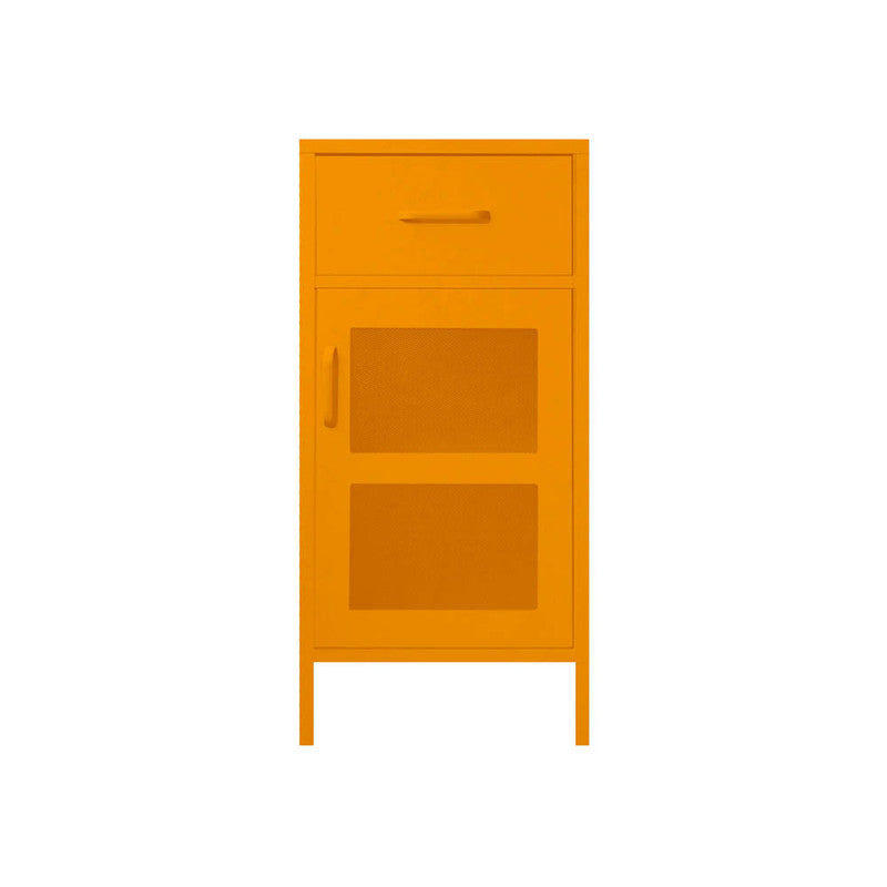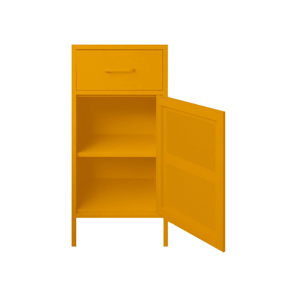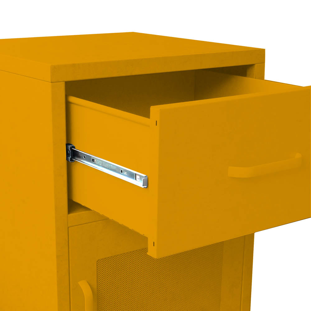 La Mesa Lateral Lite Folk Mostaza de Rockers tiene en su parte superior tiene un cajón con riel telescópico y en la parte inferior una puerta con malla donde hay un amplio espacio para guardar lo que se te ocurra. Su versatilidad te permite incorporarla en los distintos ambientes de tu hogar.